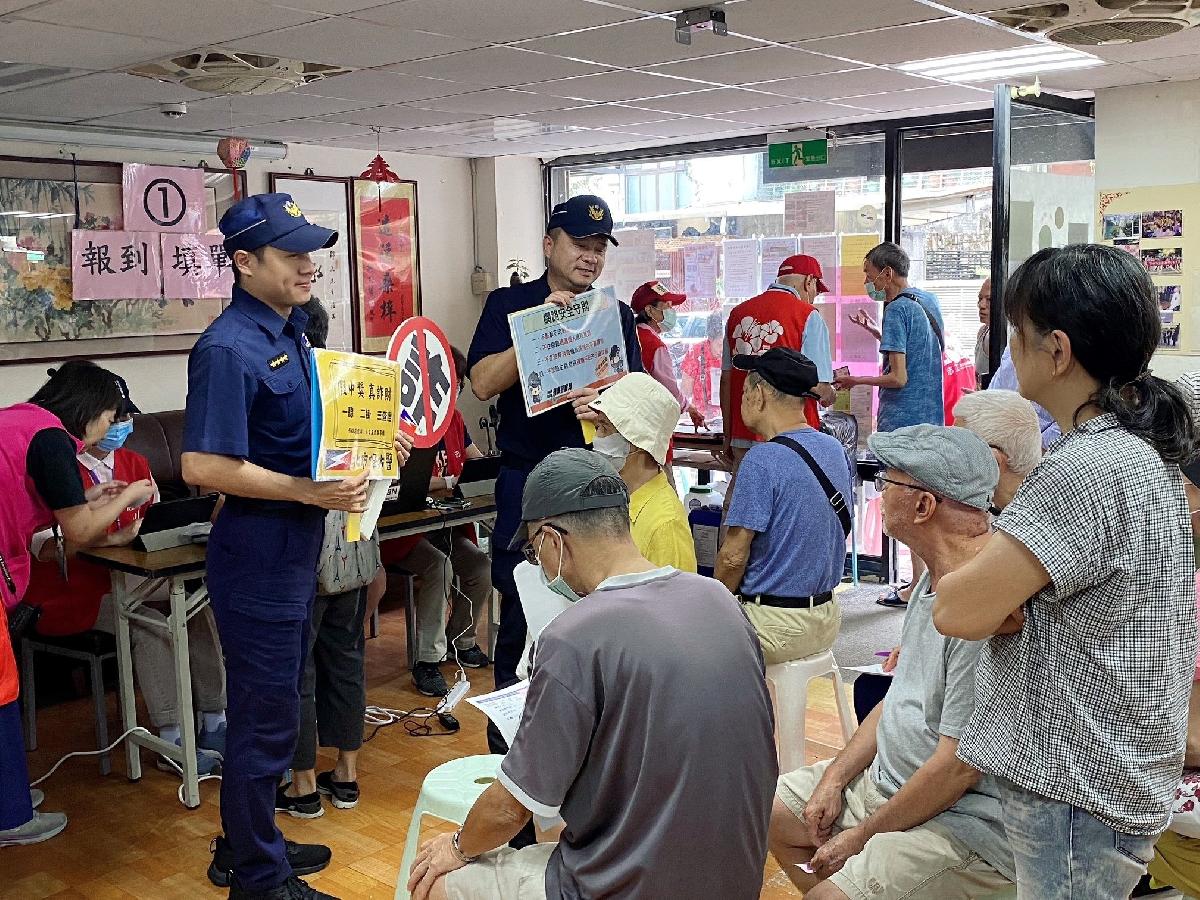 臺北市松山區介壽里為社區年長者提供免費流感疫苗接種敬老活動,為提升年長者對詐騙手法警覺性,臺北市政府警察局保安警察大隊在蔡錦文里長邀請下,前往社區進行反詐騙宣導,展現警方對於社區長者關懷與支持。