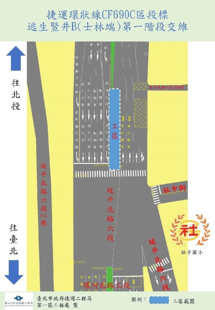 捷運環狀線北環段CF690C標工程為配合逃生豎井B(士林端)後續工程,臺北市政府捷運局第一區工程處將自113年10月22日9時開始進行延平北路六段和社中街口第1階段中央分隔島削減施工,施工範圍如附圖。 本階段工程施作期程自113年10月22日起,工期約需31天,施工期間請用路人配合減速通行及依改道宣導牌面行進,並遵循導引交通標誌及現場指揮人員指示減速慢行,民眾如有任何問題以及建議事項,或想瞭解最新施工動態,可隨時利用下列聯絡電話反映,將有專人竭誠為您服務與解說,施工造成暫時不便,敬請見諒。