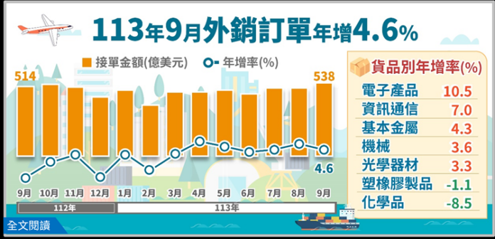 1.與上月比較:9月外銷訂單537.9億美元,較上月增加35.7億美元或增7.1%,經季節調整後減3.5%。