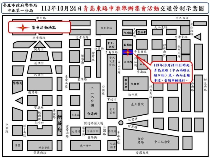 為維護前揭活動交通秩序與安全,中正第一分局業規劃交通疏導管制勤務,本次集會地點管制情形如下: