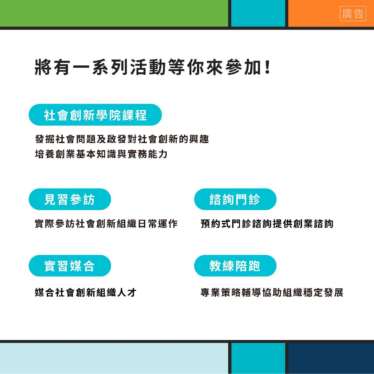 為鼓勵青年投入創新創業,臺北市政府青年局擴大創業的定義,推動「臺北市青年社會創新培育計畫」,引導有志於社會創新的青年加入社創組織,或籌備創立社會創新組織及協助NPO轉型。透過周密的培育計畫及專屬陪跑服務,青年局致力於扶持社創組織穩健成長,積極構建臺北市的社會創新生態系。