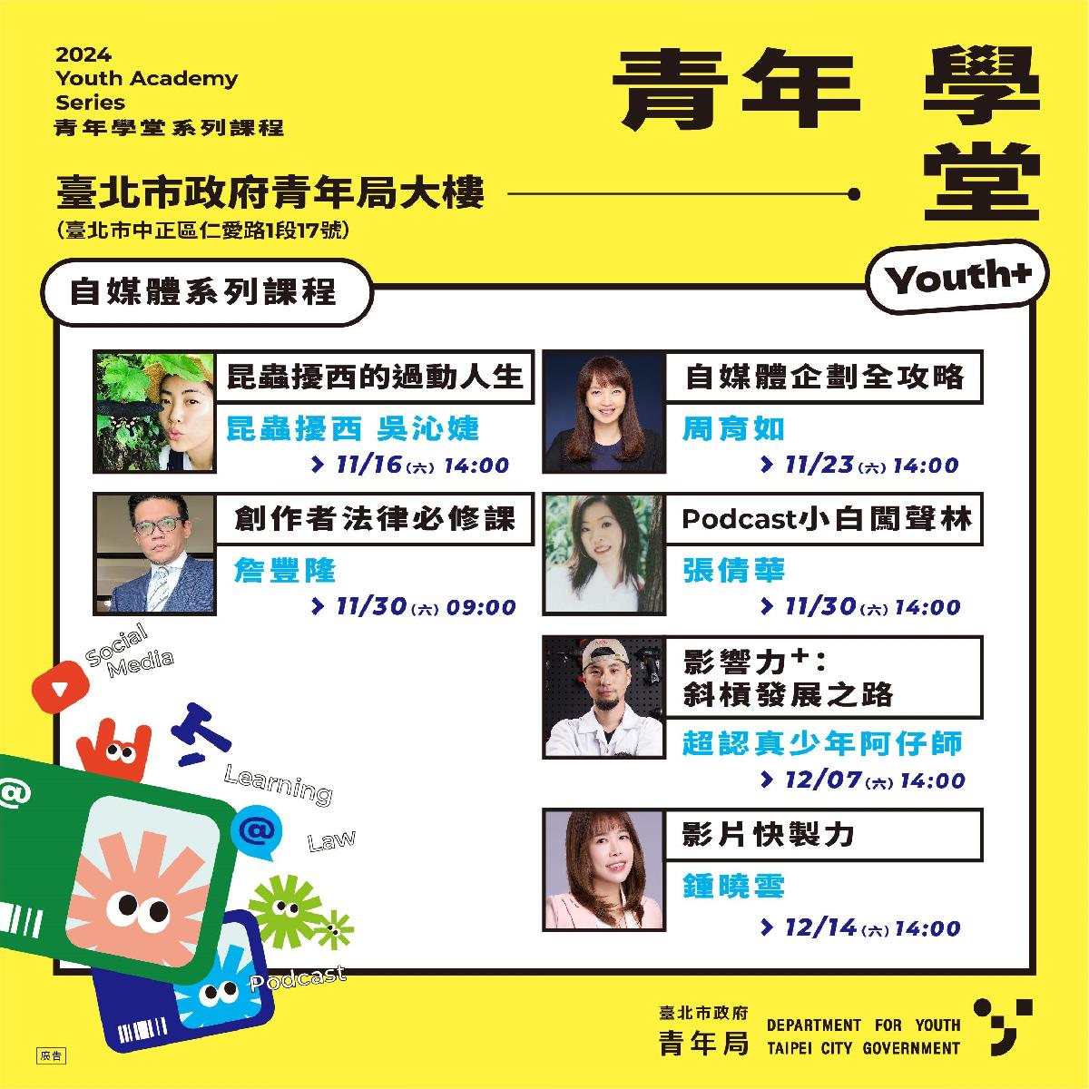 本系列將於113年11月至12月間舉辦6場精心策畫的課程與分享會,包括11/16「昆蟲擾西的過動人生」、11/23「自媒體企劃全攻略」、11/30「創作者法律必修課」及「Podcast小白闖聲林」、12/7「影響力+:斜槓發展之路」、12/14「影片快製力」,歡迎對自媒體有興趣的朋友,一起走進青年局學習、一起找到對的方向,讓青年局陪你一同探索未來的無限可能!全系列課程即日起在青年局報名系統開放免費報名,報名詳見本局報名系統(https://www.class.tcyd.gov.taipei/)或至ACCUPASS網站搜尋「青年學堂」,名額有限,先搶先贏!