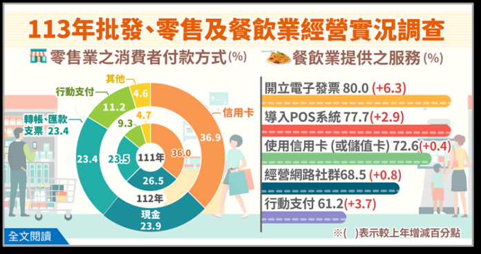 四、餐飲業提供服務以「開立電子發票」占比最高:113年5月餐飲業提供之各項服務中,以「開立電子發票」占80.0%最高,「POS系統」占77.7%居次,「信用卡(或儲值卡)支付」占72.6%居第三,「經營網路社群」及「行動支付服務」占比分別為68.5%及61.2%。與112年5月相比,以「導入手機或平板點餐系統」增9.0個百分點最多,主因業者加速數位轉型,以節省人力成本並提升出餐速度;「開立電子發票」增6.3個百分點居次,主因為政府為落實節能減碳,以租稅優惠及增加雲端發票專屬獎項等誘因,鼓勵業者及消費者使用電子發票。