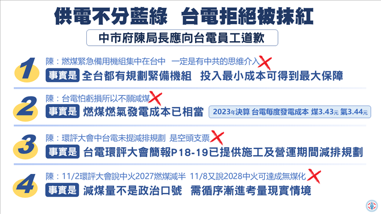 針對台中電廠的減煤規劃,台中市環保局長陳宏益上周五(11月8日)在議會答詢時說「有中共思維介入台電規劃」,為此台電表達嚴正抗議。穩定供電是仰賴專業規劃,而非政治口水,陳局長隨意「抹紅」,是對台電所有同仁的羞辱,陳局長應該向台電同仁道歉。