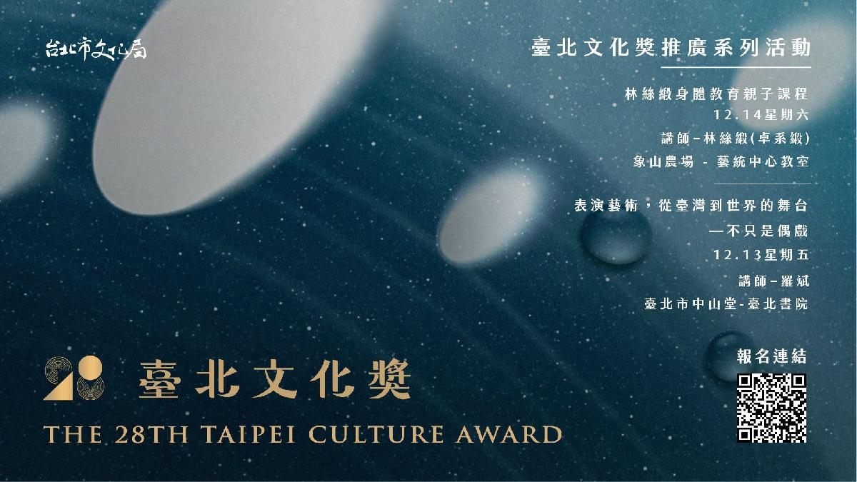 臺北市政府文化局為表彰對臺北文化領域有傑出貢獻的文化工作者,每年遴選臺北文化獎得主,今年由當代亞洲戲偶權威羅斌(Robin Erik Ruizendaal)及臺灣資深舞蹈教育家林絲緞(卓系緞)榮獲臺北文化獎殊榮,為使市民大眾更貼近兩位得主的文化成就,文化局特別邀請兩位得主舉辦系列推廣活動,分享他們在各自專業領域中的經驗與思考,讓更多人能深入了解兩位得主對於臺北文化藝術的創作,並實際感受其中所帶來的美好與影響。本次推廣活動皆為免費參加,活動名額有限,敬請提早報名!