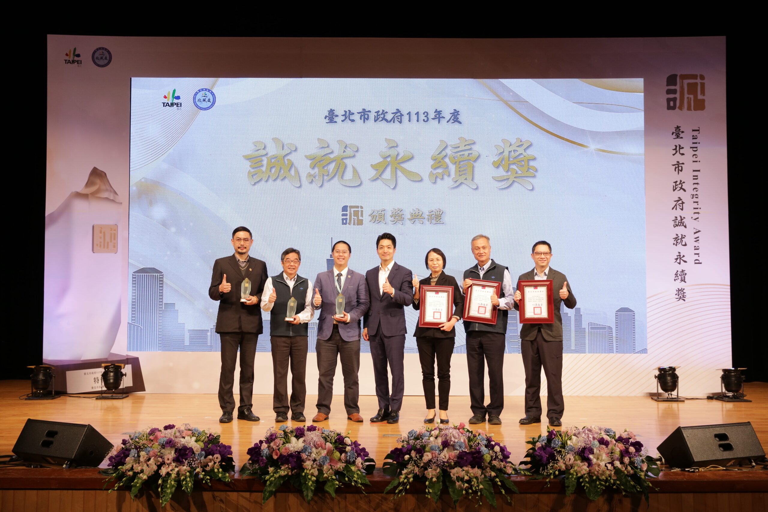 臺北市長蔣萬安今(11)日出席113年「誠就永續獎」頒獎典禮,表揚捷運工程局、體育局、資訊局、臺北自來水事業處、水利工程處、衛生下水道工程處等獲奬單位,並頒發企業誠信工作坊完訓證書。期望透過「公部門評獎激勵、私部門輔導推廣」方式,激勵公部門持續推動廉能治理,促進廉能施政;同時致力與市府往來之私部門建立合作夥伴關係,輔導及推廣企業誠信經營理念,讓臺北市做到誠信永續、清廉反貪。