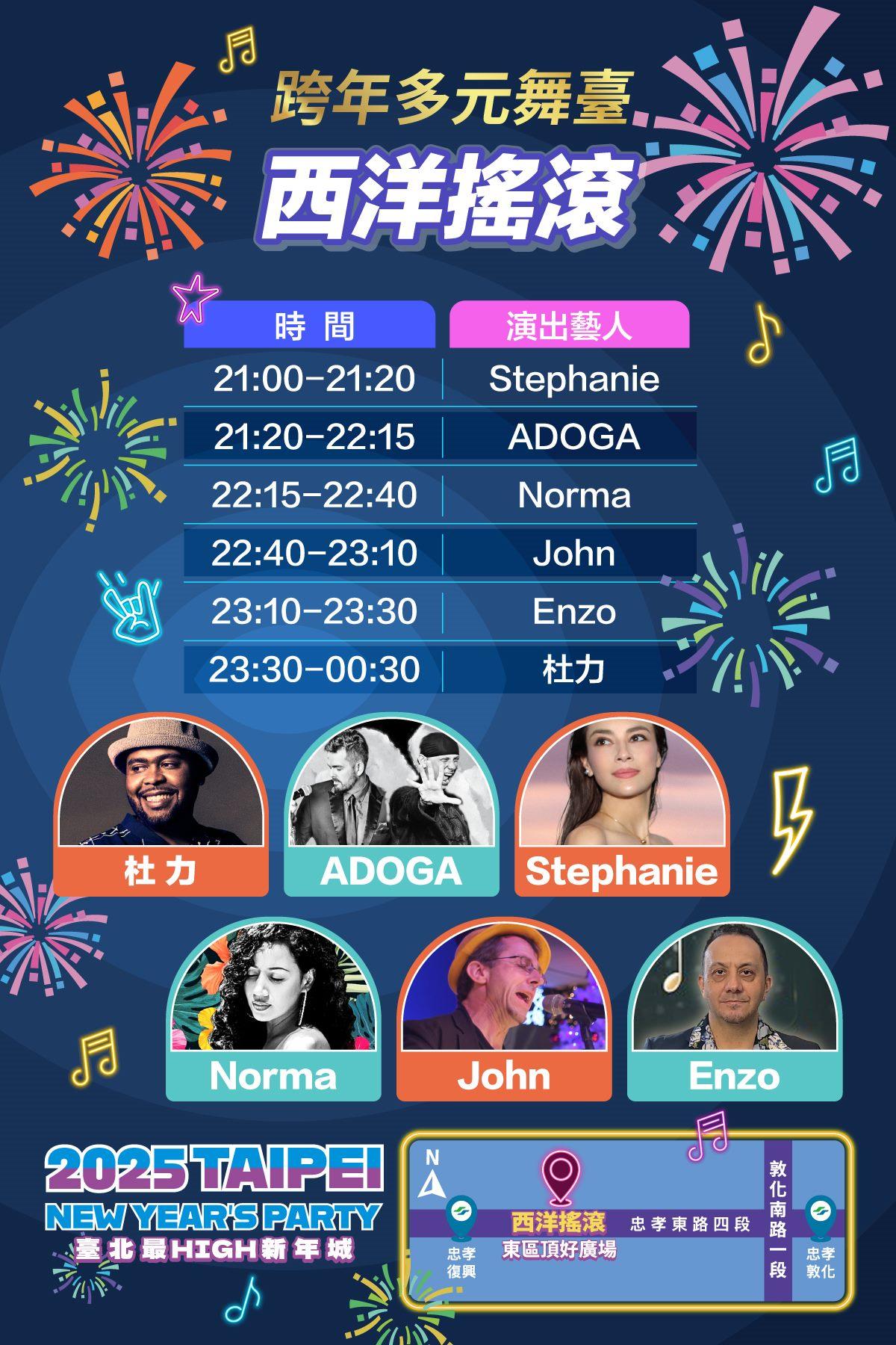 東區「頂好廣場」西洋搖滾舞臺則以西洋經典、文青節奏感兩大風格為主題,將由Stephanie、ADOGA、Norma、杜力等結合搖滾樂迷熟悉的經典旋律與現場互動,掀起跨年熱潮;而以輕鬆悠閒風格打造的Lounge悠閒舞臺,將在今年全新規劃的「象山公園」舉行,安排雙兒樂團-娃娃、簡詩敏、火星樂團等精彩演出,帶來不同的音樂體驗。