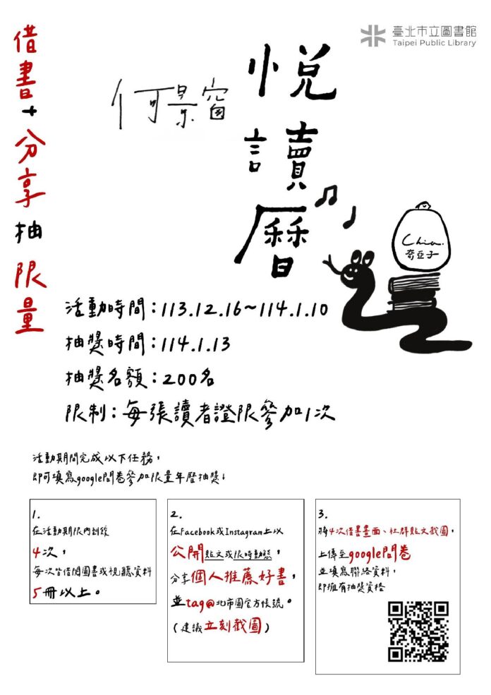 - 分享年度好書:在Facebook或Instagram發布貼文或限時動態(需設定公開),分享2024年讓你印象最深刻、最想推薦的一本好書,並標註「臺北市立圖書館服務讚」FB粉絲專頁或「臺北市立圖書館」IG官方帳號。