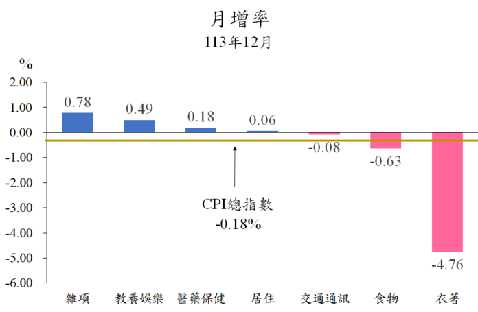 1.衣著類下跌4.76%:主因部分品牌服飾年末感恩回饋活動,持續降價促銷,成衣價格下跌7.63%所致。