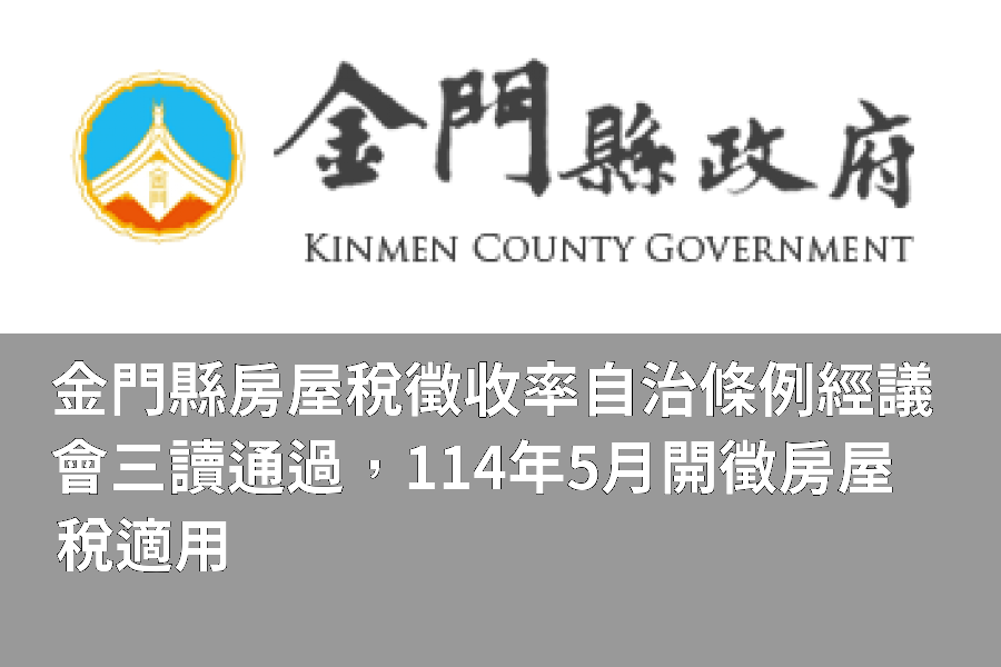 配合房屋稅條例修正,金門縣房屋稅徵收率自治條例修正案,經金門縣議會於113年12月25日三讀通過,修正內容係依照財政部公告之稅率級距及全國單一自住房屋現值一定金額基準修訂,朔自113年7月1日起施行,將在114年5月開徵之房屋稅適用。