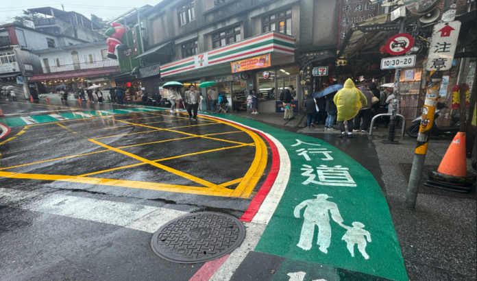 交通局專門委員林昭賢表示,九份老街每逢假日人潮車潮眾多,受限於路幅寬度有限,現況道路雙向配置各1車道後,剩餘寬度無法設置實體人行道。經重新檢視沿線路段配置後,在維持現有車道通行寬度下,於九份老街口補繪標線型人行道,並從原本的公車站延長至隔頂停車場約200公尺,導引行人明確的通行動線及範圍,並串聯整體行人通行環境。