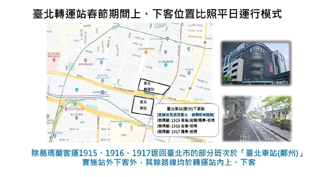臺北轉運站進駐客運路線於農曆春節連假期間,除葛瑪蘭客運由宜蘭、羅東、礁溪返抵臺北之1915、1916及1917路線部分班次仍維持於「臺北車站(鄭州) 」站外下客(位置如附圖)外,其餘各路線均於轉運站內上、下客;為確保轉運站運作順暢,臺北市公運處已要求客運業者及轉運站增派服務人員協助疏運,並協調於轉運站周邊重要路口加派義交指揮,客運業者亦將配合於尖峰時段增開班次,使旅客得以順利返鄉。