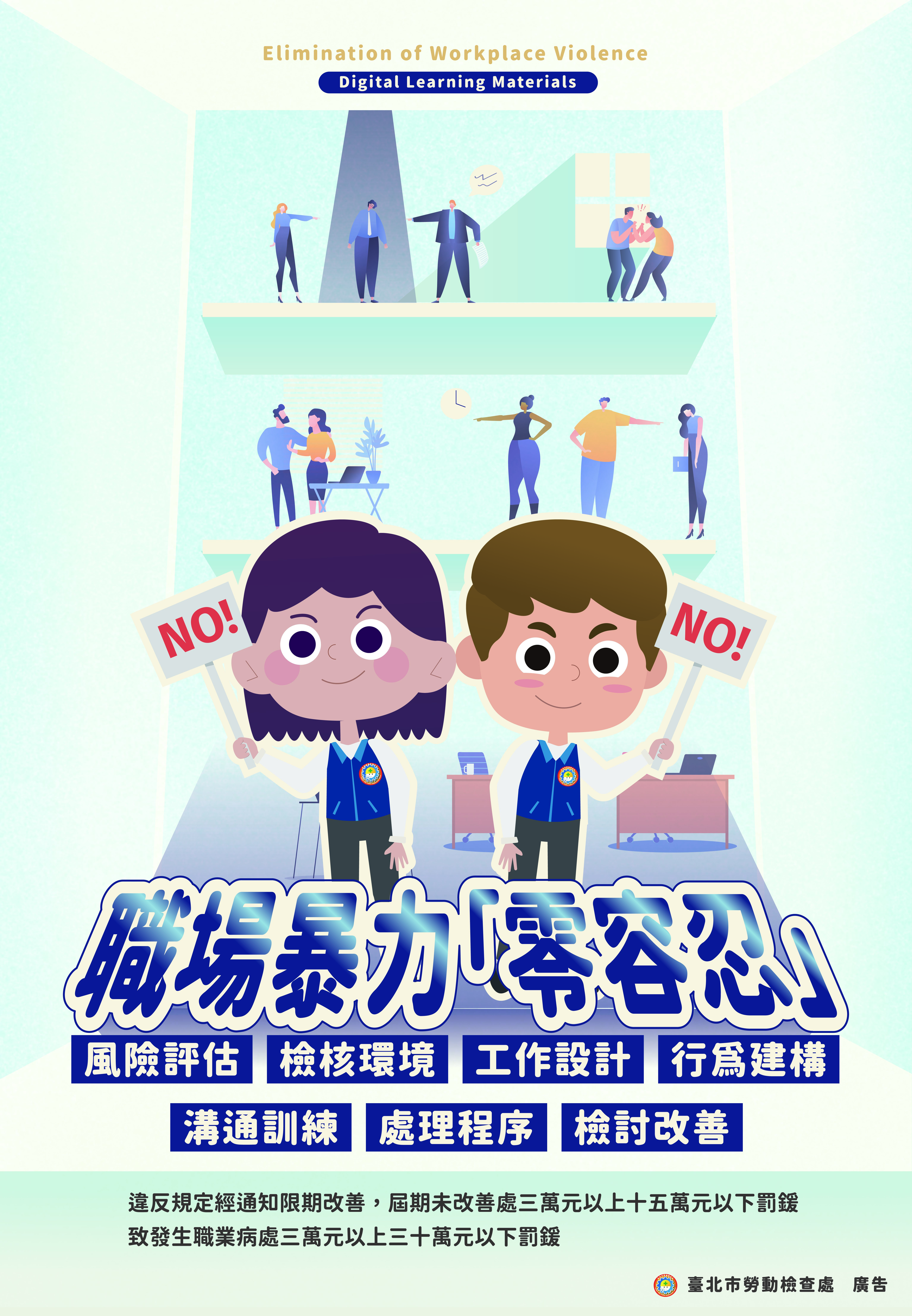 勞檢處梁蒼淇處長指出,雇主應依法建構完善的防範措施及事件處理程序。勞檢處將持續辦理相關教育訓練並加強勞動檢查,事業單位如違反規定,經通知限期改善,屆期未改善者,將處三萬元以上十五萬元以下罰鍰。