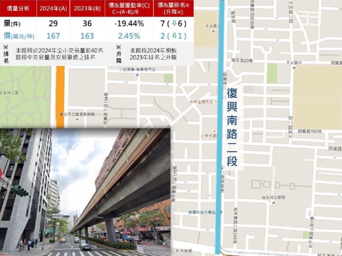 地政局針對2024年實價登錄的買賣案例,以屋齡5年為界,分別統計新成屋及中古屋交易量前40名的熱門路段,並以平均交易單價排序。除計算各路段交易量及單價,同時呈現與2023年相較之變動幅度及排名升降(詳圖2),讓市民朋友可輕鬆讀懂北市熱門交易路段近1年量價變化。