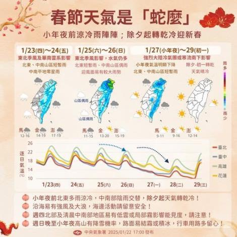 中央氣象署預報,嘉義地區27日(小年夜)至29日(初一)清晨,受冷氣團南下影響,天氣非常寒冷,易有10度以下低溫;30日(初二) 受輻射冷卻影響,早晚天氣偏冷,嘉義縣政府呼籲養殖漁業,應確實做好防寒措施。