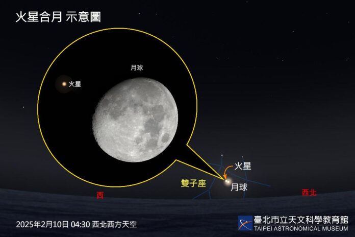 「火星合月」是指從地心向外看,月球與火星經度相同的天象,通常是月球與火星在視角上最接近的時候,但從不同地點觀察,兩者最接近的程度與時刻也有所不同,而「月掩火星」則是月球與火星接近到發生掩蔽的少見天象。本次火星合月發生於2月10日(一)凌晨3時36分,在俄羅斯至格陵蘭之間部分高緯度地區可以欣賞到從掩入到復出的完整過程,而日本、韓國及華南沿海一帶則只能看到掩入。