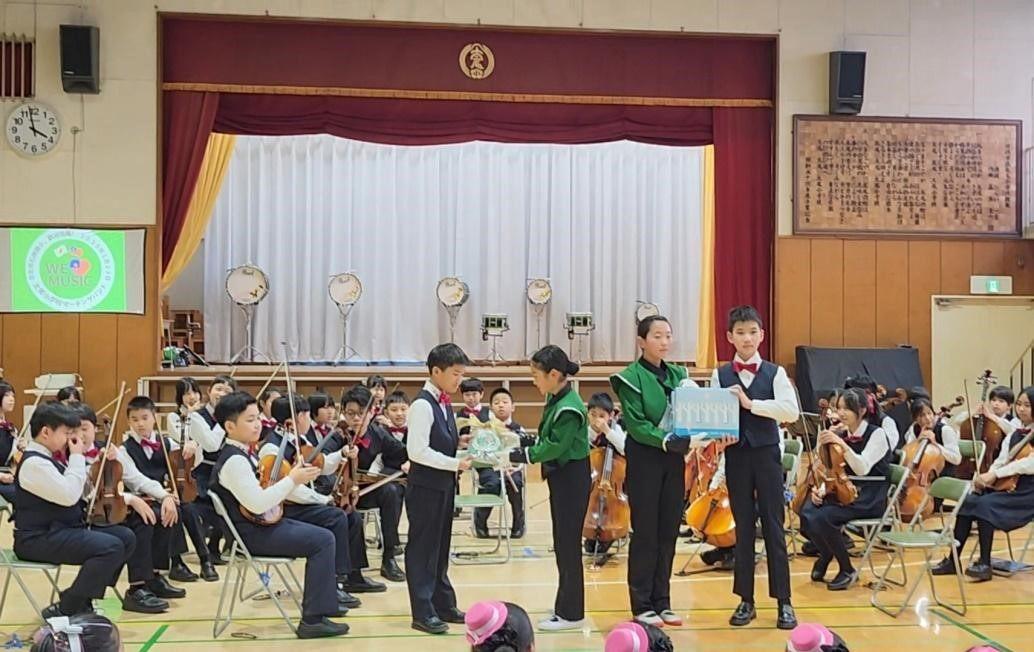兩位校長致詞後,開始學生合奏的演出。結合弦樂、管樂與旗隊,共同演出曲目為: 多啦a夢主題曲、名偵探柯南主題曲。兩校學生雖是第一次合奏,卻表現得默契十足,精彩滿分!合奏演出後,兩位校長互贈紀念禮品,兩校學生也開心交換禮物。隨後由石牌國小弦樂團指揮黃思瑋老師,帶領石牌國小弦樂團進行演出。全程將近30分鐘,精彩的背譜演奏,獲得熱烈的掌聲,也為這次臺日兩校的交流,畫下完美的句點。