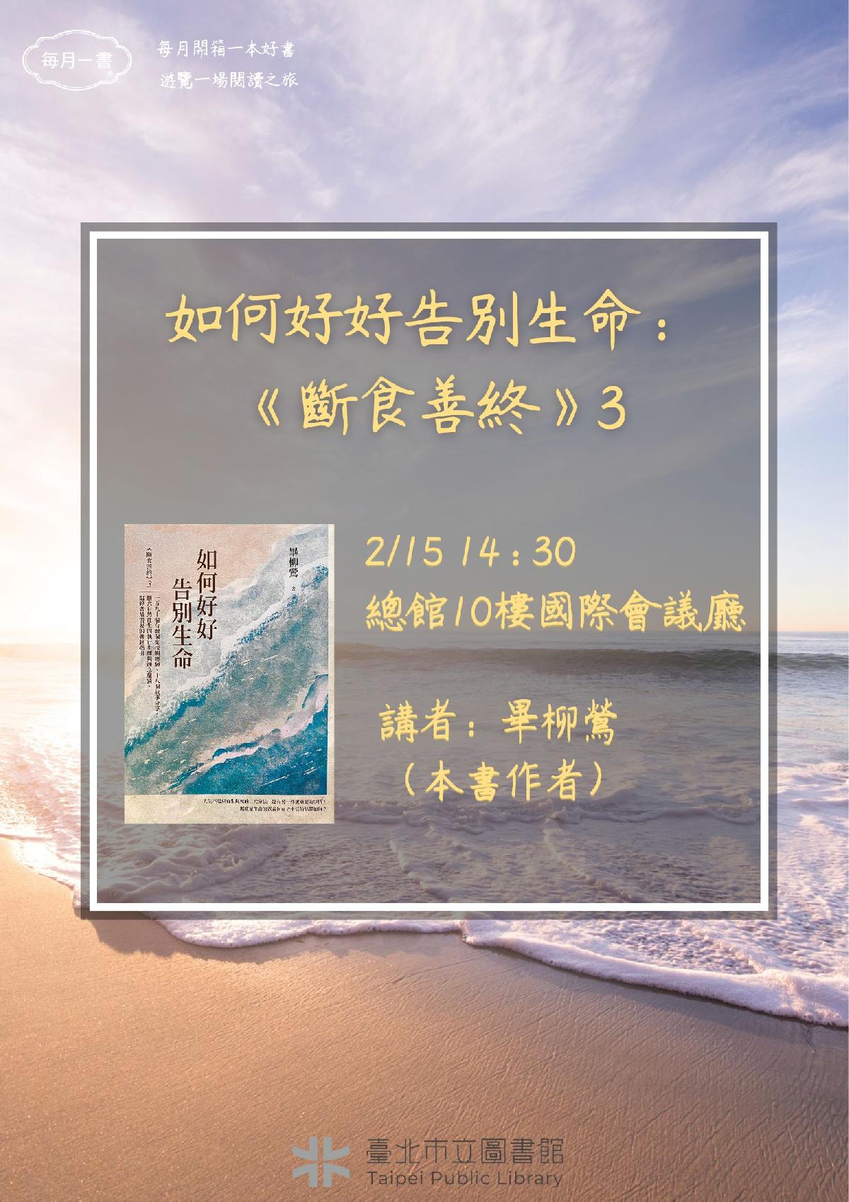 臺北市立圖書館2月份每月一書講座推薦圖書為《如何好好告別生命:斷食善終3》,將邀請本書作者─畢柳鶯在2月15日(星期六)於總館10樓會議廳進行導讀分享。