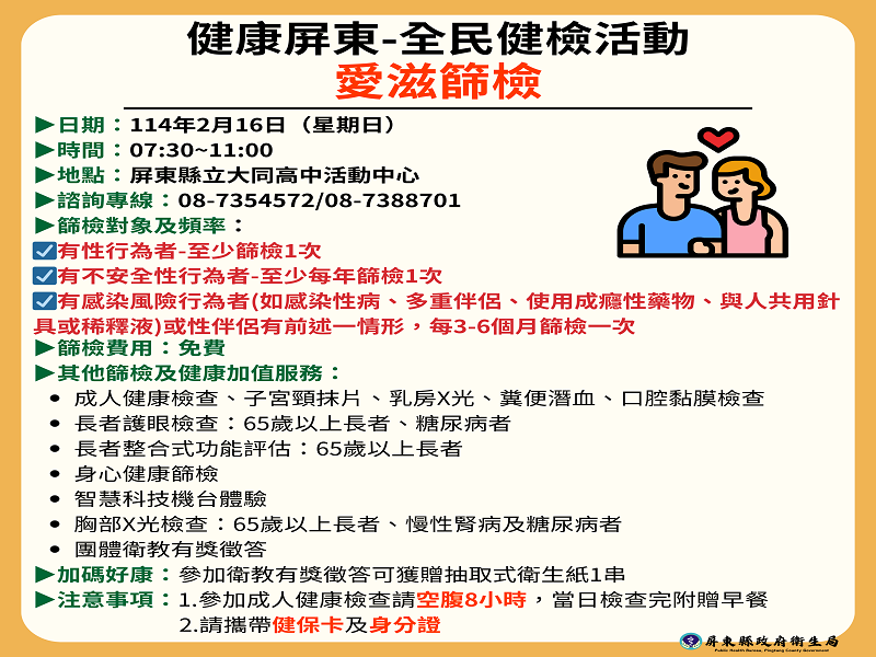 今(14)日是一年一度的浪漫西洋情人節,伴侶間互相表達愛意的同時,也別忘了愛自己。屏東縣政府衛生局將於2月16日上午7時30分至11時在屏東縣立大同高中活動中心,舉辦「蛇年躍動慶豐年、健康屏東揪您來篩檢」活動,當天提供愛滋免費篩檢服務。衛生局籲請民眾,愛自己,即刻行動,逗陣相揪來篩檢,讓幸福「蛇」進來。
