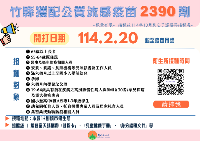 近日冷氣團冷空氣影響,呼吸道病毒傳染持續,疾管署增購10萬劑流感疫苗,撥配新竹縣共2390劑,將於2月20日起,於13鄉鎮市衛生所開放接種,新竹縣政府衛生局呼籲,請尚未接種流感疫苗的公費對象、高風險族群盡速完成接種,可獲得保護力,降低感染流感後發生重症甚至是死亡的風險。