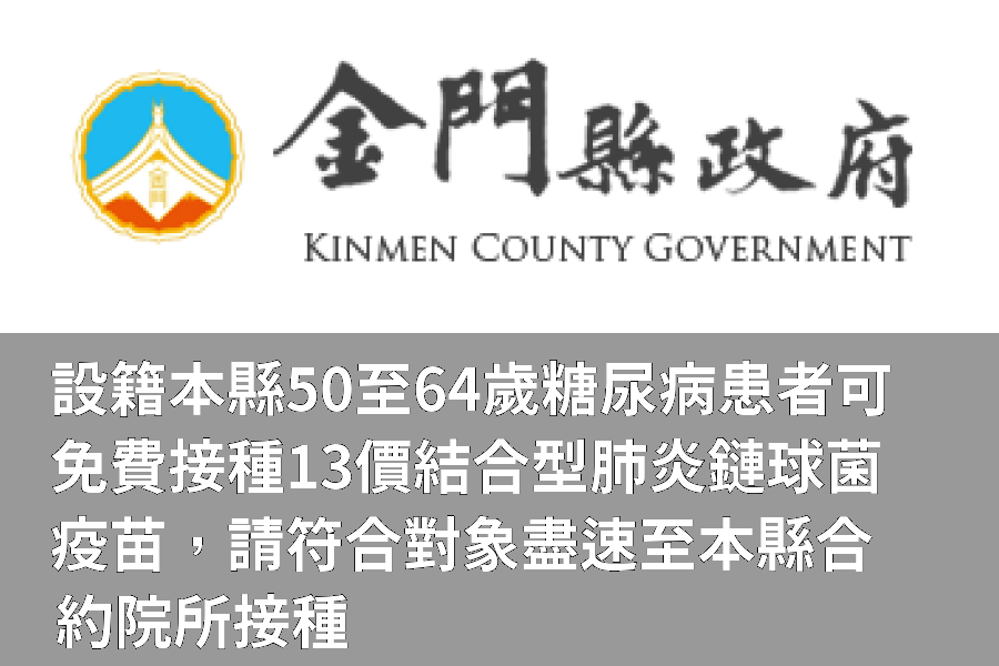 另外衛生呼籲, 65歲以上民眾可接種1劑公費13價結合型肺炎鏈球菌疫苗及 23價肺炎鏈球菌多醣體疫苗,以提升良好免疫記憶、提供較長免疫保護力,並使保護範圍拓廣,以有效減少侵襲性肺炎鏈球菌感染症發生風險,有意願接種者可逕洽本縣合約院所,包含有衛生福利部金門醫院、各鄉鎮衛生所、禾心診所、安仁家醫科內科診所、傅仰賢診所、吾家診所、三大診所及陳水湖診所等,請鼓勵並安排家中符合資格鄉親儘速完成接種,共同守護家人的健康。