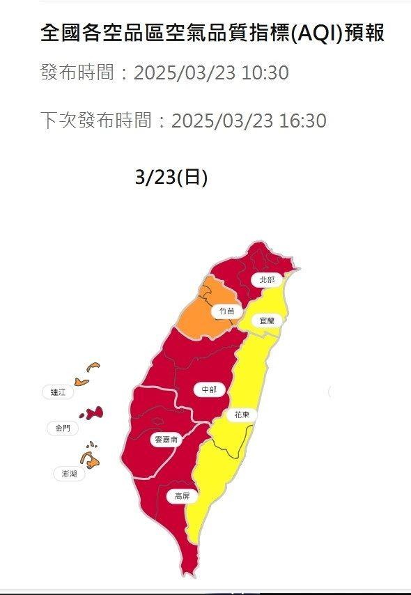 環保局指出,今(23)日受高壓迴流影響,為東南風環境,臺灣海峽北部有背風渦旋活動,為北部地區帶來微弱的偏西至西北風環境,擴散差污染物易受累積,依據環境部最新空氣品質預報,北市上午可能空氣品質指標(AQI)大於100,達對敏感族群不健康等級(指標污染物為細懸浮微粒),另因午後光化作用影響,下午AQI有機會大於150以上,達對所有族群不健康之紅色等級(指標污染物為臭氧8小時)。