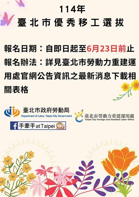北市勞動局長王秋冬表示,為了鼓勵外籍移工與雇主維持良好勞資關係,更肯定他們對台灣社會的貢獻,今年臺北市持續辦理優秀移工選拔,表揚這些在臺默默耕耘,勤懇付出的移工朋友們。即日起至6月23日前止,受理北市優秀移工的選拔推薦,本年度將選出12名優秀移工及3名鼓勵獎項。獲選者除將透過表揚典禮頒發獎座,還有豐富的獎金(或同等價金之禮券),未來也將薦送勞動部參加全國模範移工選拔。