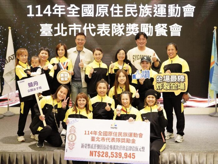 無原鄉部落的臺北隊,上月遠征高雄舉行的全國原住民族運動會,橫掃39金19銀21銅共79面獎牌,總成績全國第二名更刷新臺北市於原民運上的最佳排名,其中除籃球、棒球、柔道、鉛球等項目完成連霸外,傳統競賽如競舟、撒網、傳統負重、路跑、射箭等均斬獲佳績。蔣萬安市長與體育局游竹萍局長、原民會巴干‧巴萬主委昨晚出席慶功宴,北市原住民李芳儒議員及李傅中武議員也前來同慶。