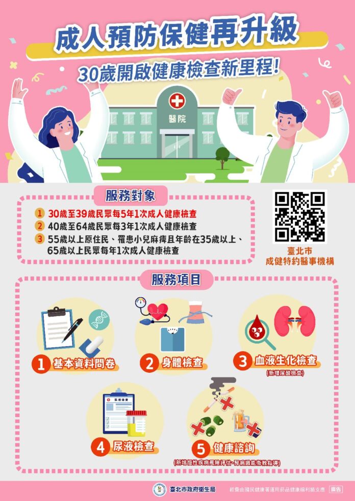 成人預防保健是維持健康及預防慢性病重要措施,透過定期篩檢、健康管理及培養良好生活習慣,可有效降低疾病風險,根據衛生福利部國民健康署2019至2023年國民營養健康調查顯示,三高盛行率有年輕的趨勢,30至39歲分別為高血壓9.7%、高血糖2.5%、高血脂18.7%,臺北市衛生局黃建華局長表示,為使青壯世代能盡早發現三高風險,健康檢查更顯重要,114年起擴大提供30至39歲民眾每5年1次健康檢查服務,服務內容包括健康行為調查、身體檢查、抽血檢查、尿液檢查、衛教諮詢等,有效針對血壓、血糖、血脂、肝腎功能及身體質量指數等問題及早介入,衛教諮詢的部分更增加慢性疾病風險評估、腎病期別提示、提供健康飲食與身體活動等資訊,鼓勵更多年輕族群養成定期健康檢查的習慣。
