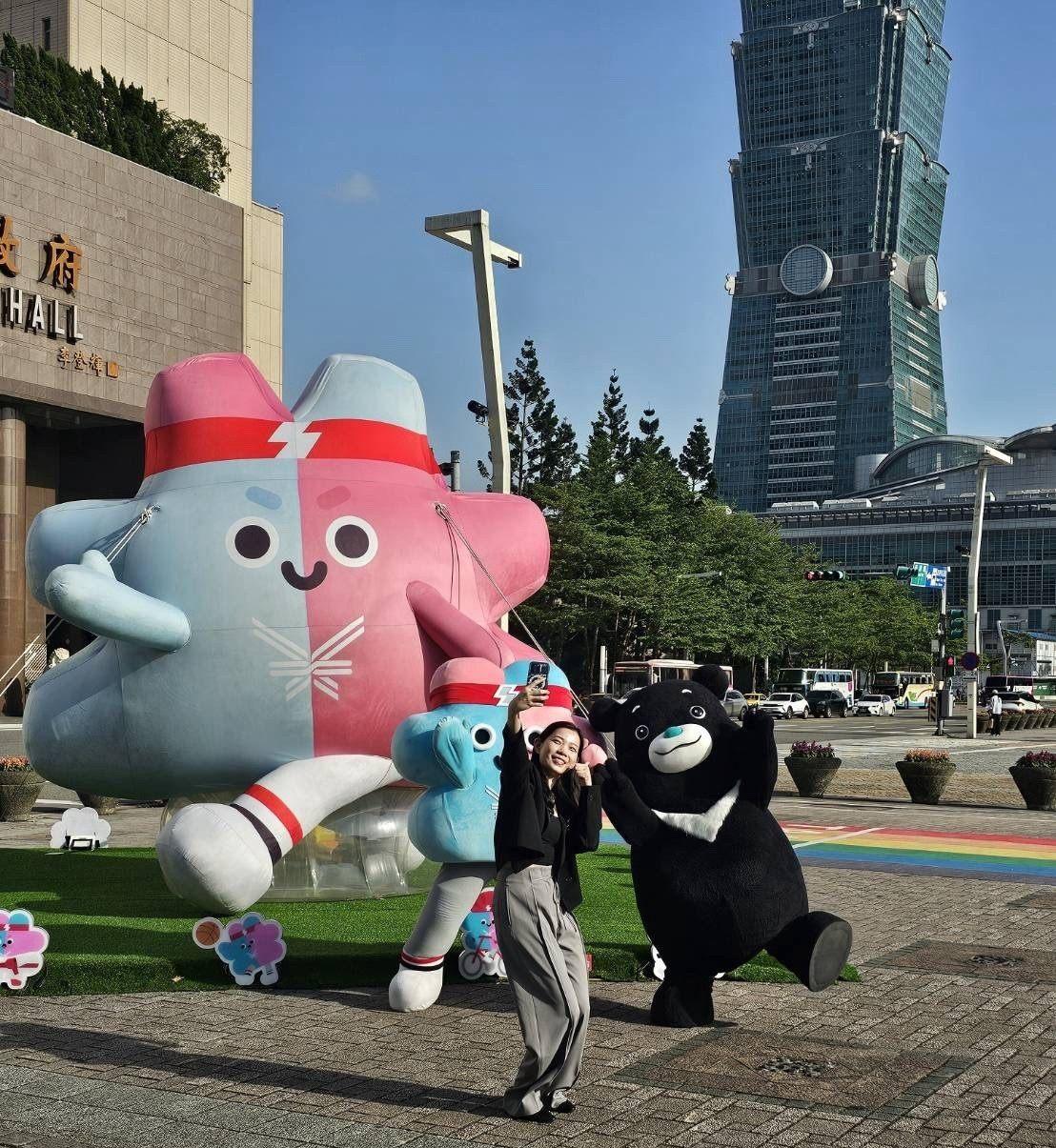 在臺北市民廣場前的「壯寶氣偶」已成為臺北市最熱門打卡景點,觀傳局長余祥與吉祥物壯寶、熊讚一起合影宣傳2025雙北世壯運。