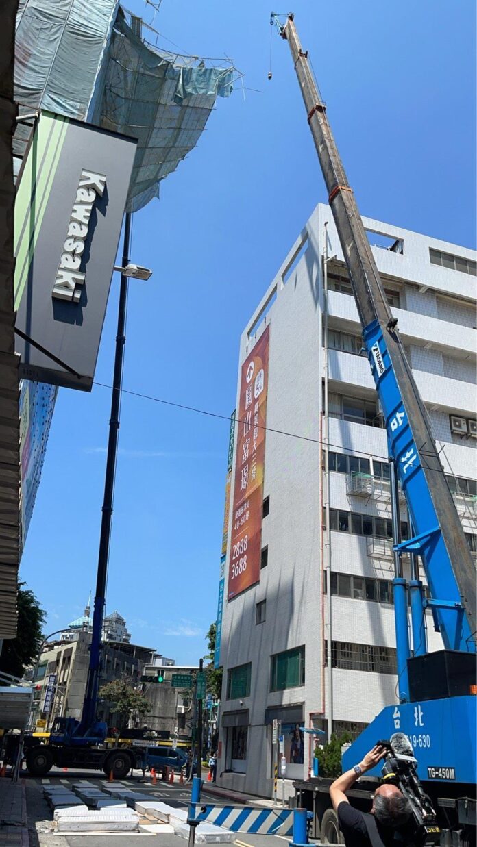 該基地係由炎洲股份有限公司申請拆除(案號 113 拆字第 0079號),承造單位為旺洲開發股份有限公司,建築規模為地上 10 層、地下 2 層。據瞭解,施工人員於上午操作怪手拆除頂樓帷幕玻璃牆面時,因帷幕牆柱內鋼筋強度不足,導致整面牆體滑落撞擊鷹架,造成繫拉桿斷裂,致使鷹架結構傾斜,此工程事故造成一部自小客車受損,所幸無人傷亡。警方第一時間即封鎖現場並實施交通管制,大型吊車亦已到場協助排除傾斜結構。建管處為防止事故擴大,已立即勒令工地全面停工,並依「建築法」第 84 條及第 89 條規定,裁處新臺幣 9 萬元罰鍰。後續並將要求承造單位提出復工計畫,經專業技師公會審查同意後方可復工。