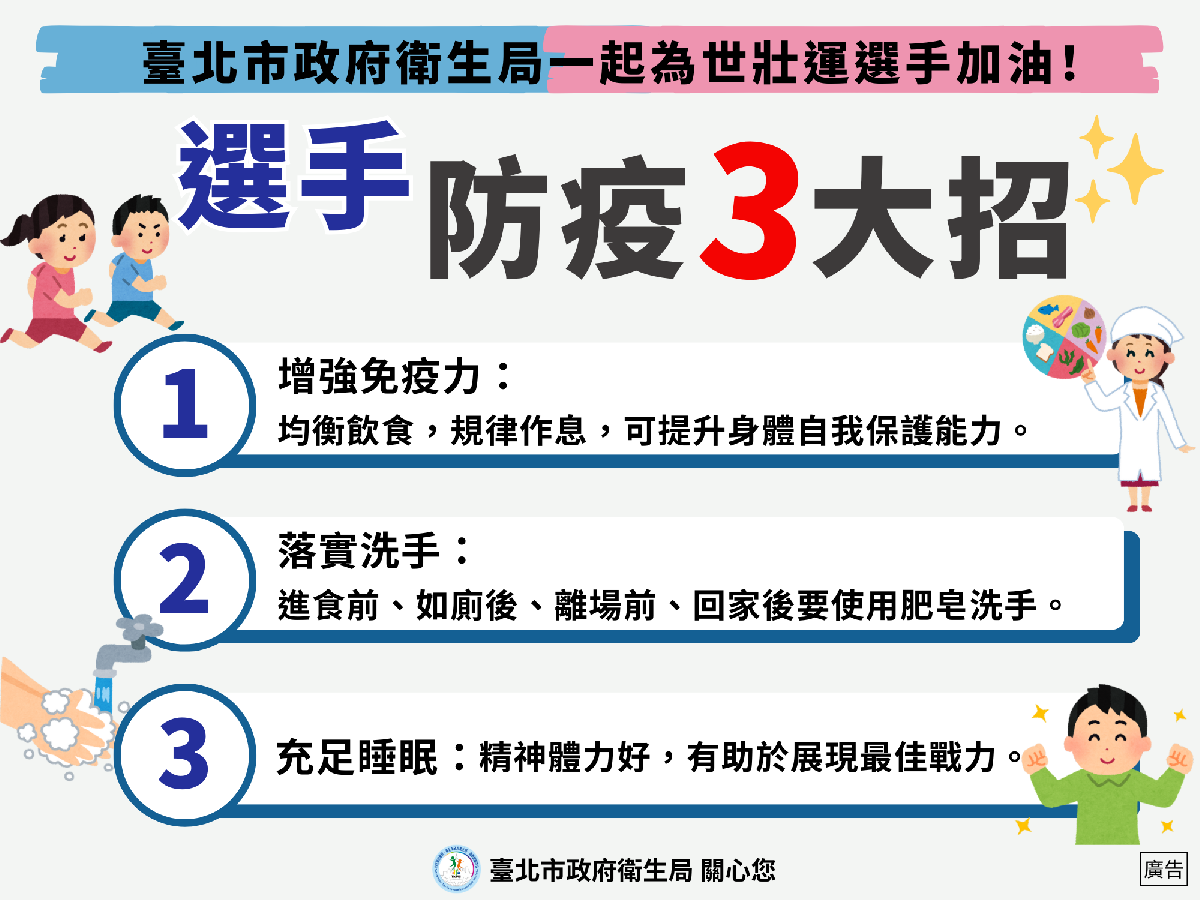 北市衛生局呼籲參賽選手養成良好衛生習慣,落實防疫3大招,即可在賽場上展現亮麗的成績: