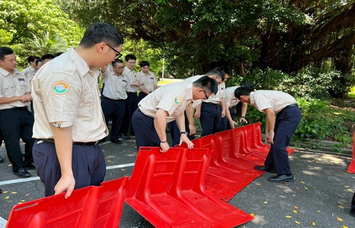 課程最大亮點之一,是首次於防災訓練中導入充氣式防洪牆設置演練,讓役男親自學習此類新型快速部署設備的操作要領。除傳統的沙包堆疊與抽水機操作外,亦包含活動式防洪板架設,讓役男在實地演練中掌握各類防汛設施的運用與部署程序。役男們表示,實際操作比單純課堂講授更具體且印象深刻,能夠清楚了解災時第一線應變的實際狀況工作重點及器械操作,對未來實際支援任務更具信心與能力。