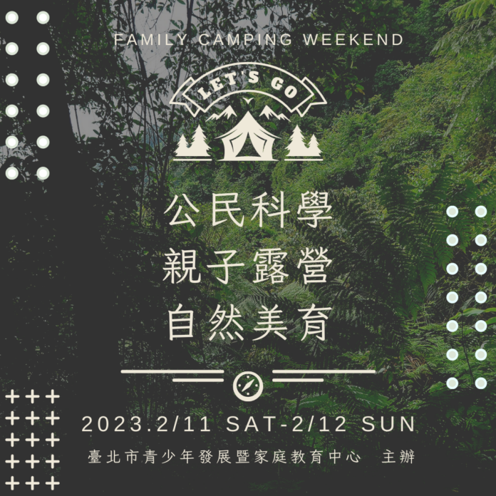 臺北市青少年發展暨家庭教育中心(原臺北市青少年發展處)青少年公民科學特蒐團要再次啟動啦!因應今年10月青發處與家庭教育中心合併成青發家教中心,明年度青少年公民科學特蒐團特別在2月11日~2月12日規劃一場「公民科學x自然美學x親子露營」的親子露營party,安排了滿滿的戶外踏查體驗和兒童自然手作、搭配親子之間愛的任務,要讓參加的家庭身心靈都滿載而歸!活動將於112年1月3日(星期二)下午1:30起於青發家教中心報名網站開放報名(https://reurl.cc/VRly4y)。