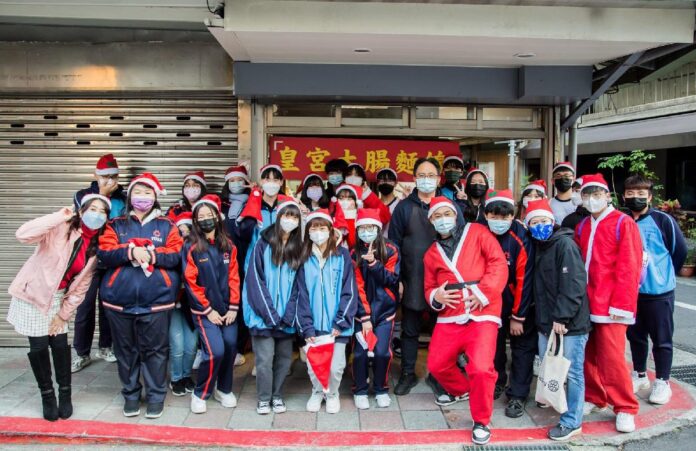 ▲臺北育達高中學務處姜兆旻主任(前排左1)帶領行政團隊同仁、班聯會同學前往鄰近商家報佳音,傳遞平安與祝福