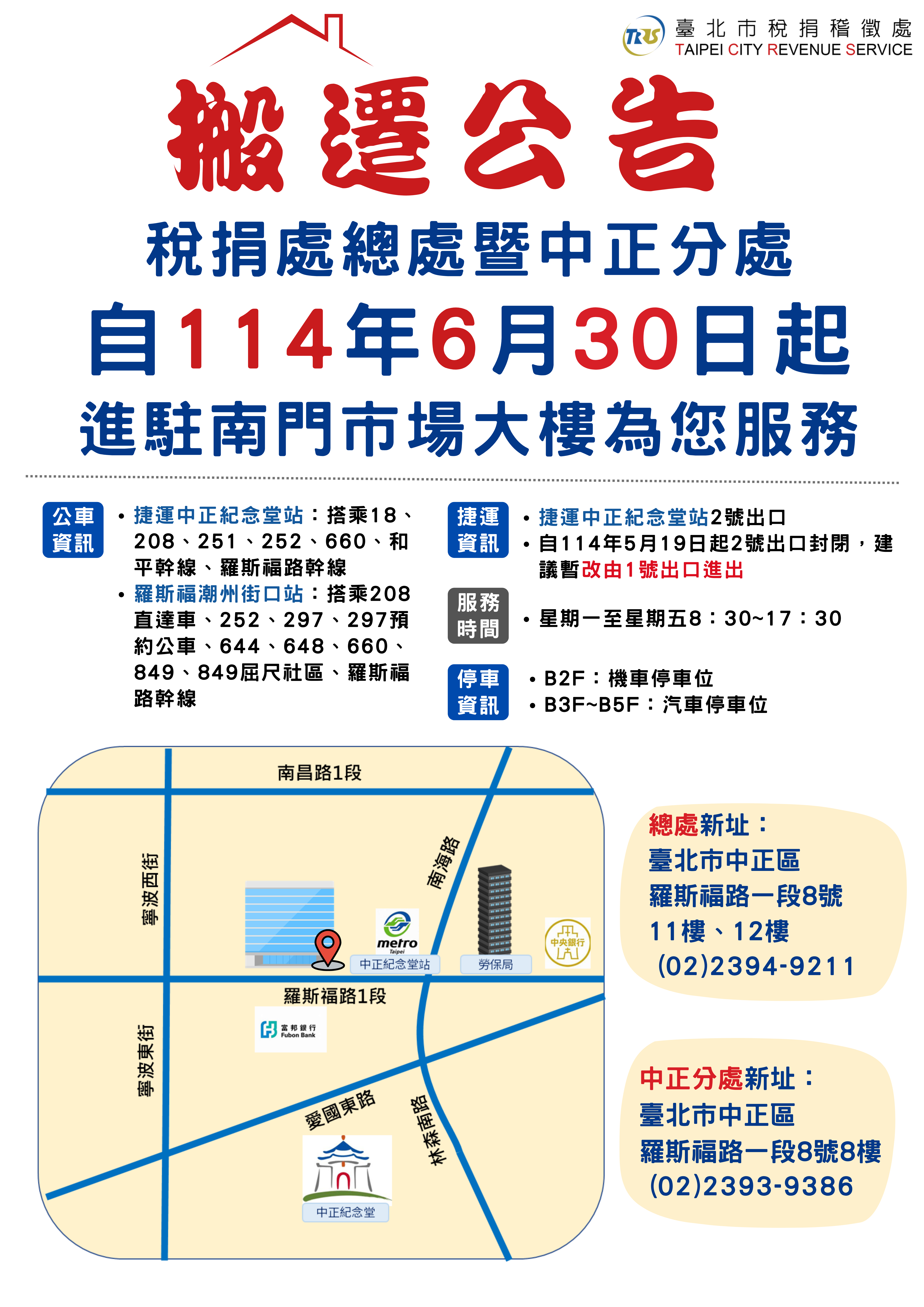 臺北市稅捐處總處暨所屬中正分處將於114年6月30日(星期一),搬遷至臺北市中正區羅斯福路1段8號(南門市場大樓),總處位於11樓及12樓、中正分處位於8樓。原址北平東路7-2號將提供服務至6月27日(星期五)下午1時30分止,當日下午若需洽公的民眾可至該處鄰近分處辦理,敬請見諒。
