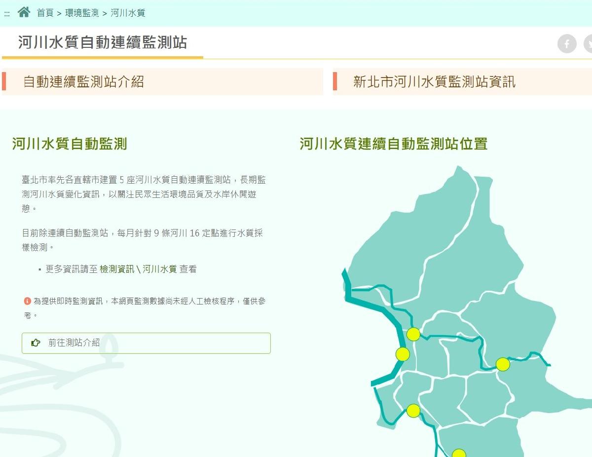 為即時掌握河川水質變化,臺北市已於淡水河本流及其主要支流設置5座固定式太陽能水質自動監測站,全天候監控水溫、酸鹼值、溶氧與導電度等重要指標,並即時上傳數據至監測平台。