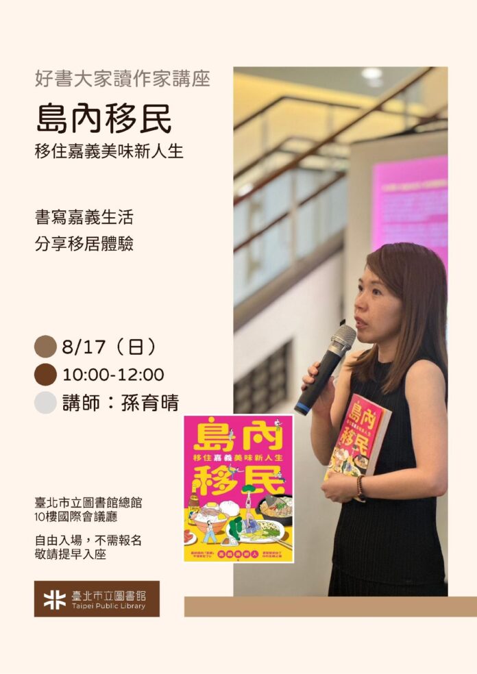 8月17日將邀請《島內移民:移住嘉義美味新人生》作者孫育晴,分享移居嘉義的真實經歷。孫育晴透過真摯的筆觸,記錄許多嘉義市新人口的共同心聲,她的嘉義生活書寫在臉書上廣受好評,此次講座將帶領讀者探索嘉義這座城市、深入了解島內移民的心境轉變以及探討現代人尋找歸屬感的深刻議題。