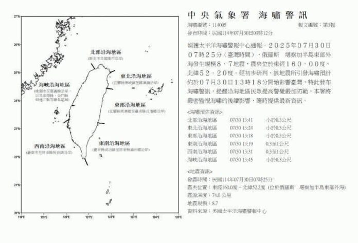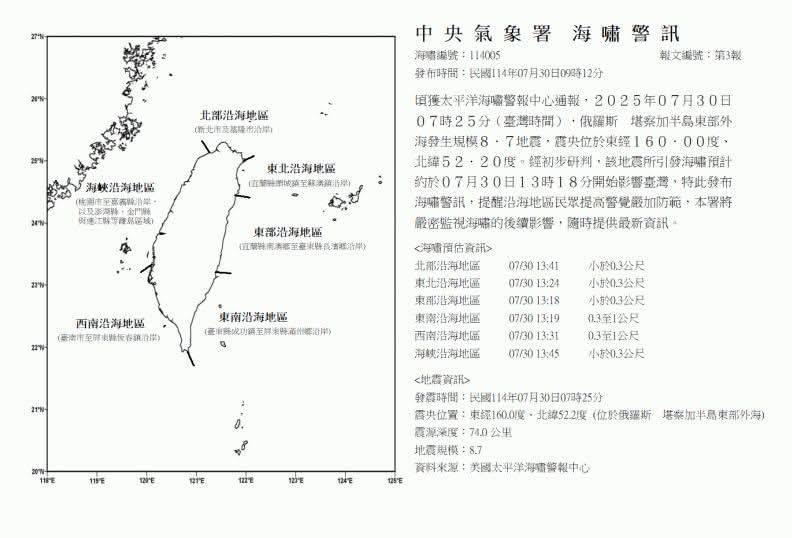 今日俄羅斯堪察加半島東部外海發生規模8.7地震,經中央氣象署初步研判,地震所引發海嘯預計約於7月30日13時18分開始影響臺灣,特此發布海嘯警訊,馬管處提醒遊客注意沿岸大浪,如非必要儘量避免前往海濱活動。 #海嘯預估資訊 北部沿海地區 07/30 13:41 小於0.3公尺 東北沿海地區 07/30 13:24 小於0.3公尺 東部沿海地區 07/30 13:18 小於0.3公尺 東南沿海地區 07/30 13:19 0.3至1公尺 西南沿海地區 07/30 13:31 0.3至1公尺 海峽沿海地區 07/30 13:45 小於0.3公尺
