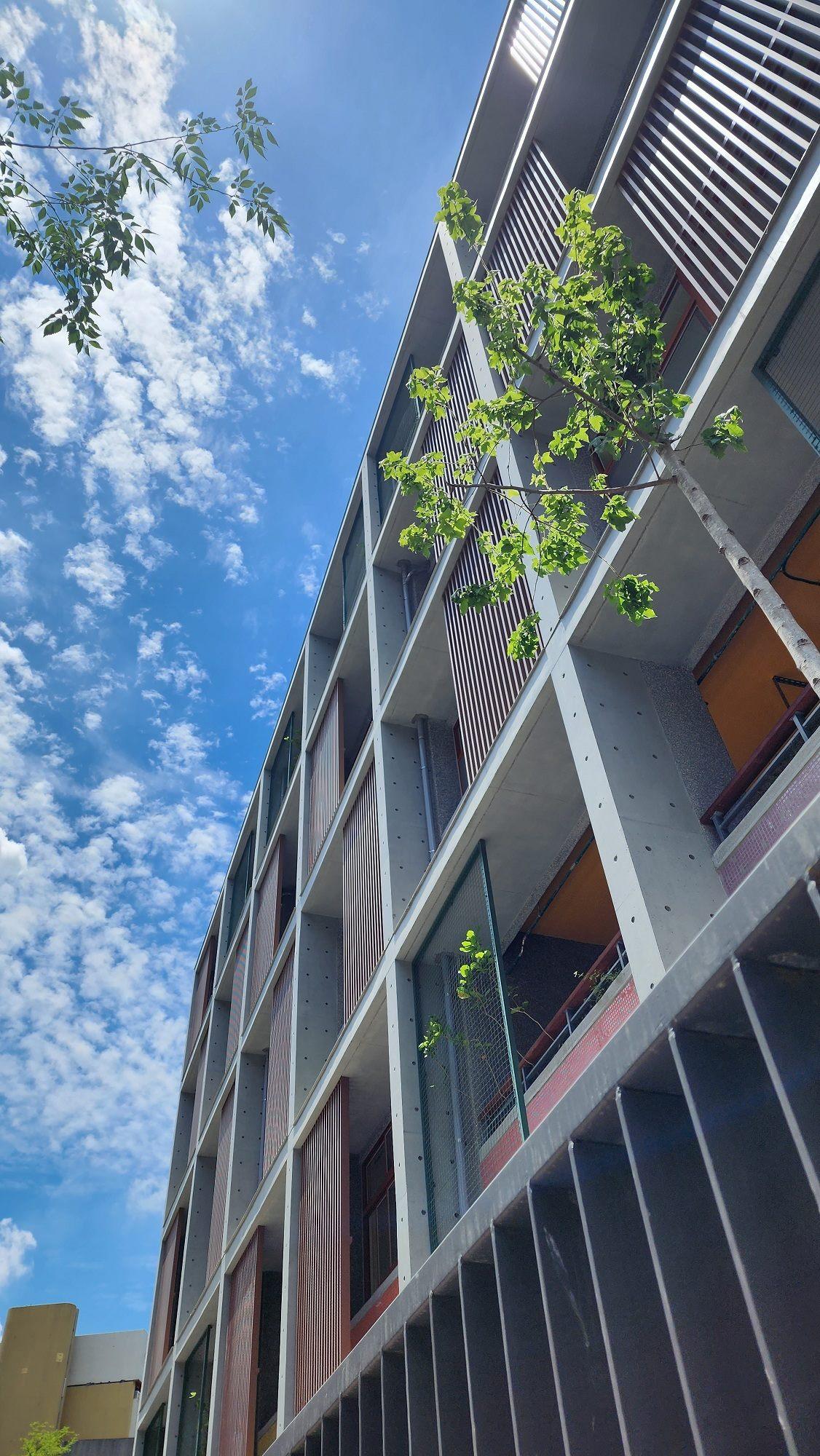 在都市密集環境中,新和國小採用挑空設計,保留風道與視線穿透,促進通風與採光。搭配綠牆、屋頂花園等設施,有效降溫與節能,打造舒適學習環境。這不僅是建築手法,更是一場節能減碳的實踐。