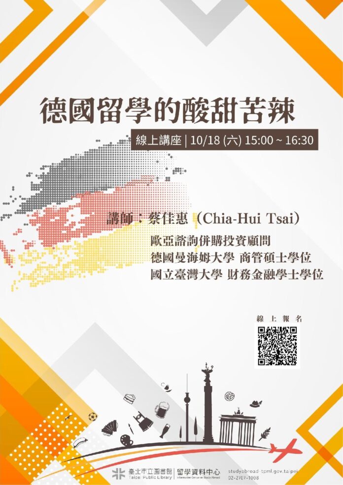 臺北市立圖書館留學資料中心於10月18日(星期六)下午3時邀請畢業於德國曼海姆大學商管碩士的蔡佳惠講師,分享留學德國的酸甜苦辣、德國大學申請介紹、學生生活、海外學習計畫、德語學習及求職等個人經驗分享。歡迎計劃前往德國留學的學生與一般民眾連線參與!