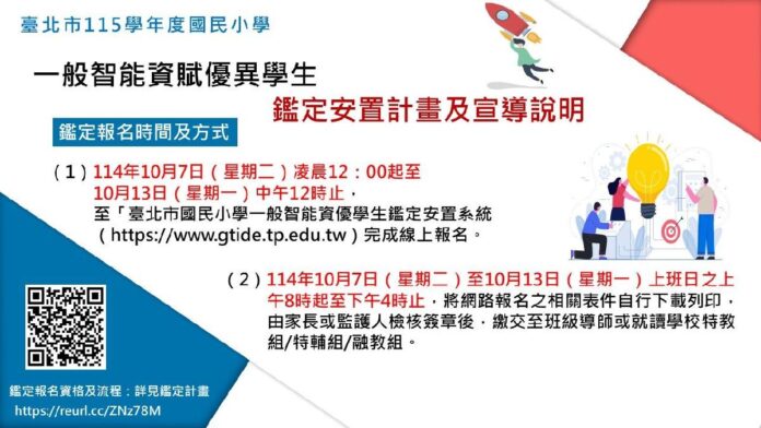 【主題:臺北市115學年度國小資優學生鑑定10月7日起開始報名】