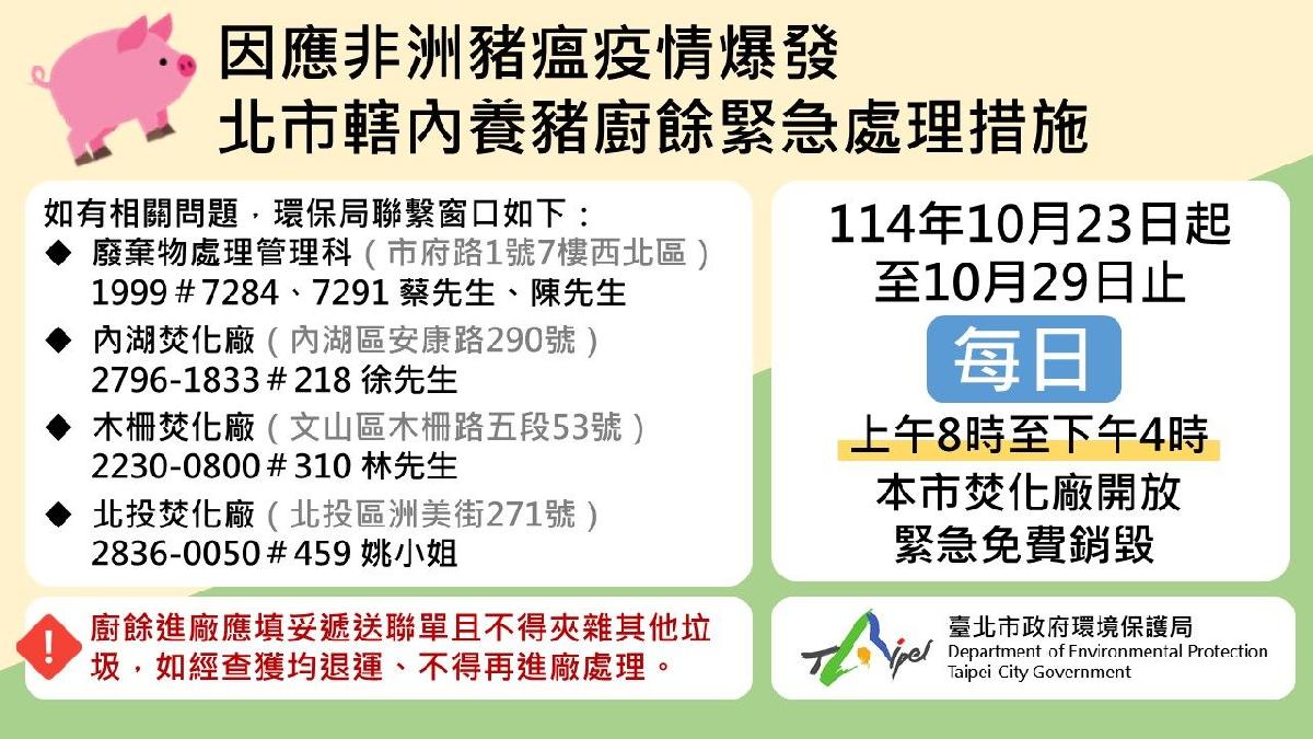 環保局指出,臺北市餐廳、百貨、美食街、公司行號、飯店、旅館、市場、夜市、機關、學校、公司行號等非家戶產源,其無法再送交養豬場餵飼豬隻再利用之養豬廚餘,可於114年10月23日至29日期間,每日上午8時起至下午4時止,填妥廚餘進廠遞送聯單(格式如附件1)後,自行或委託合法清除機構緊急將養豬廚餘送至內湖、木柵或北投垃圾焚化廠傾卸銷燬,環保局將免收處理費用,以減輕緊急應變期間相關產源單位負擔。