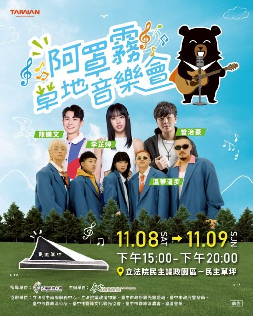 本活動由交通部觀光署參山國家風景區管理處主辦,結合草地音樂、市集與在地文化特色,打造以「綠色永續旅遊」為主題的多元藝文饗宴。活動現場除邀請多組人氣歌手輪番登台演出,並設有文創特色市集、夜間裝置藝術展示及霧峰騎旅等豐富體驗。誠摯邀請民眾共襄盛舉,一同感受阿罩霧的自然風光與文化魅力。 活動日期:114年11月8日(星期六)至11月9日(星期日) 活動時間:下午15:00 至 下午20:00 活動地點:立法院民主議政園區-民主草坪 活動亮點: - 草地音樂會:邀請知名藝人陳謙文、李芷婷、曾治豪、溫蒂漫步等精彩演出。 - 文創市集:匯集地方特色品牌與創意攤位。 - 跳蚤市場(二手市集):推動循環再利用理念,歡迎民眾報名設攤。 - 夜間裝置藝術:結合光影設計,展現霧峰夜色風情。 - 騎旅活動:串聯霧峰在地景點路線。