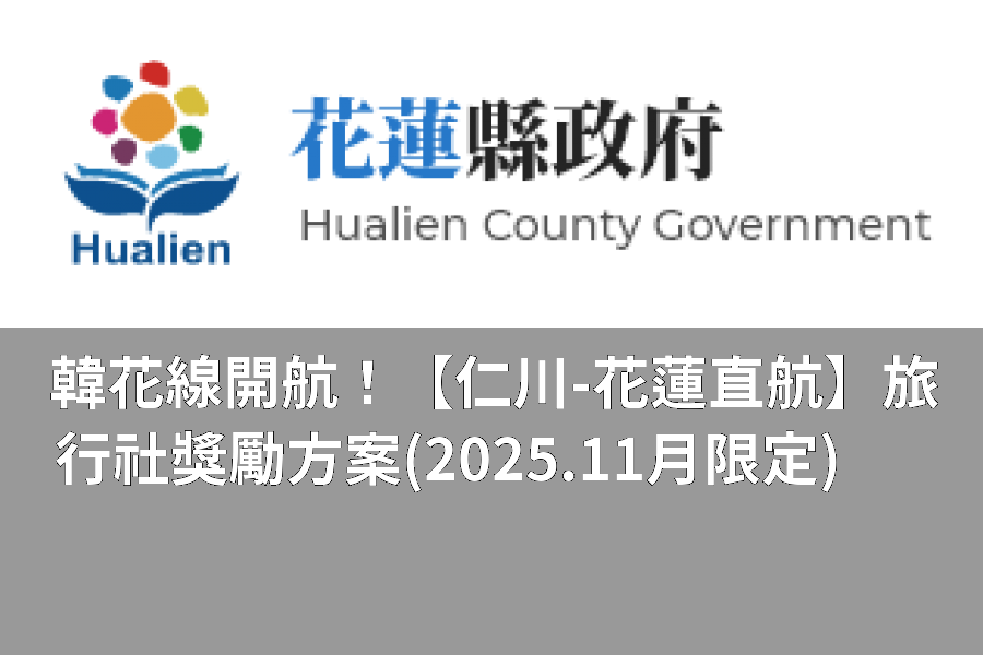 花蓮縣政府為迎接韓國仁川—花蓮直航航線正式啟航,永續遊花蓮加碼11月限定【仁川-花蓮直航】旅行社獎勵方案,以實質獎勵回饋業界,鼓勵旅行業者結合新航線設計多元旅遊行程,積極開拓韓國旅客市場。