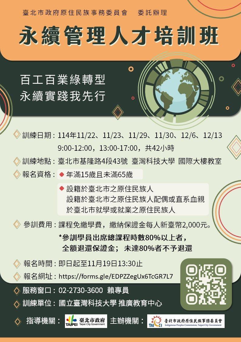 臺北市政府原住民族事務委員會(以下簡稱北市原民會)積極培育原住民人才,協助族人了解企業需求,提升永續管理專業能力、強化職場競爭力與就業發展,創辦「永續管理人才培訓班」,將於114年11月22日至12月13日於國立臺灣科技大學開課,為企業綠色轉型注入新能量。