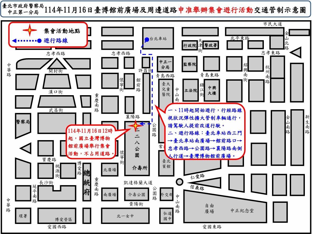 為維護前揭活動交通秩序與安全,中正第一分局業規劃交通疏導管制勤務,本次集會地點及遊行路線說明如下: