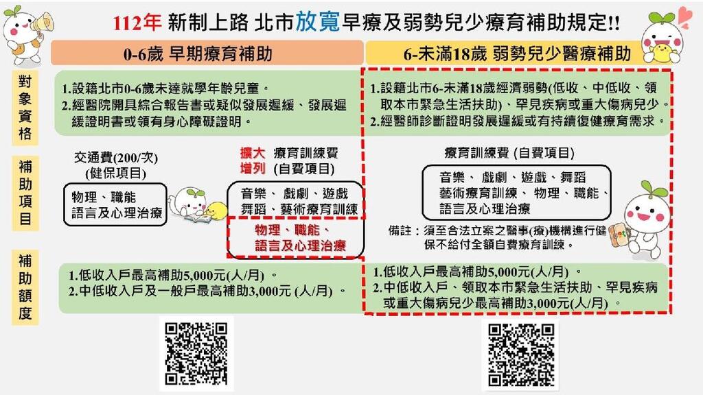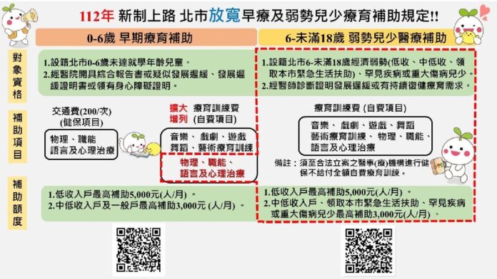 姚淑文強調,自112年放寬臺北市「發展遲緩兒童早期療育補助計畫」自費補助規定,增列補助自費物理治療、職能治療、語言治療、心理治療,且取消同一日同處進行療育項目者,其交通費及療育訓練費僅得擇一補助之限制,讓發展遲緩兒童可就近及時獲得療育服務。未來,針對弱勢家庭持續幫助慢飛兒童延續就醫及復健效益,「弱勢兒童及少年醫療補助」也將放寬低收、中低收家戶持續補助療育費用至未滿18歲兒少,減輕家庭負擔,重視每一個孩子的發展過程,協助每個慢飛天使的家庭,及早給予所需的資源。