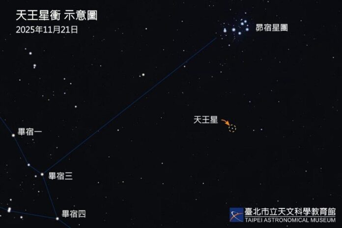 今年的「天王星衝」將於11月21日(五)登場。所謂「衝」,是指行星與太陽在天球上經度相差180度,此時天王星與地球距離最近,亮度也最高,達到接近肉眼可見極限的5.6等,是全年觀測這顆冰巨行星的最佳時機。