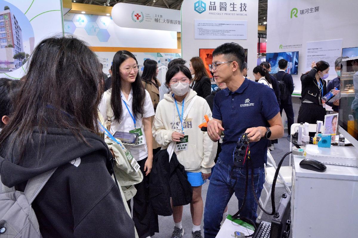 參訪首站由生技企業瑞寶生醫接待,團隊專家介紹多年深耕的幹細胞、外泌體、生物活性衍生物研究成果,包括再生醫學與癌症免疫細胞治療,並創新研發手持電漿煥膚儀,透過EMS微電流,啟動全新醫美技術布局,同時兼顧醫學與美學。學生表示在觀展後表示意猶未盡,刷新了自己對醫療領域的理解,原先以為醫療多侷限於治療與臨床,但透過展覽發現科技已深入預防醫學、健康促進,甚至應用到醫美及輔具創新。也有學生分享,這次參訪讓她更清楚醫療領域需要跨工程、科技與人文思辨的整合能力,這將成為她在高中基礎價值培育及未來生涯選擇的重要思考方向。